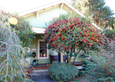 Turns out it didn’t take much: we added corner boards, a skirt board, wider door and window surrounds, and some color – just enough to give some definition between the siding and the trim – while keeping the palette very traditional. Away went the shutters, the brick retaining wall for the front walk, and the oddly proportioned windows. We picked out two accent colors: a bright, yellowy green and a deep, almost black purple for her to use as she decorates the front porch and fills out the planters.